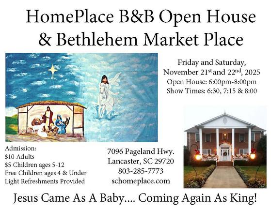 We welcome you to join us to experience the journey of Mary and Joseph as they traveled to Bethlehem. There was no room in the inn for them, but can you find room in your heart? Tour the house featuring over thirty trees, experience a live nativity, then enjoy some Christmas treats in the dining hall.